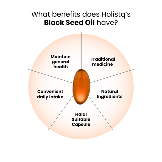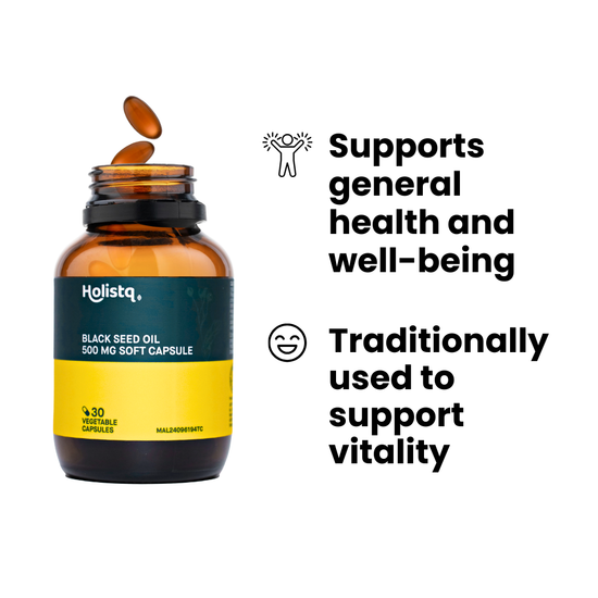 Holistq Black Seed Oil Capsules are formulated using premium Nigella sativa (Black Seed) oil, traditionally used to support general health and wellbeing. Each soft capsule contains 500mg of pure black seed oil, carefully extracted to preserve its natural benefits.